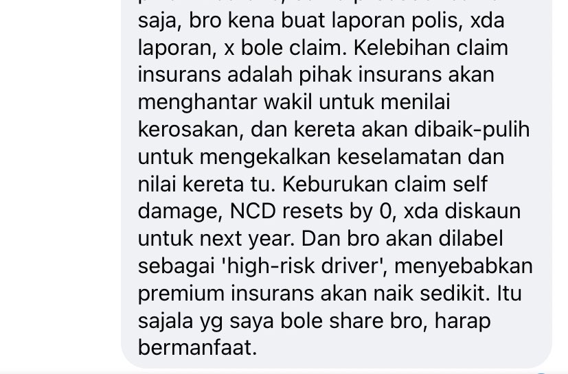 Malangnya ramai rakyat malaysia yang agak biasa dengan keadaan ini. Contohnya macam kita add windscreen la, jadi kena tambah dalam rm70. Tetapi motosikal tersebut melanggar kereta saya iaitu kereta b yang menyebabkan kerosakan. Terdapat langkah atau cara untuk claim insuran kereta yang perlu diambil untuk membuat laporan polis dan tuntutan insurans sekiranya terlibat dengan kemalangan jalan raya yang membabitkan kerosakan kereta tanpa sebarang kecederaan fizikal kepada pemandu. Tuan bengkel berkenaan meminta saya berhubung dengan penarik kereta berkenaan untuk berbincang namun tidak mengangkat panggilan yang dibuat oleh saya serta memberi janji kosong. Jika anda menggunakan plan perlindungan komprehensif, anda layak untuk membuat tuntutan kerosakan sendiri namun anda akan kehilangan diskaun tiada tuntutan (ncd). Setiap kereta yang dimiliki selalunya akan dilindungi insuran komprehensif. Matlamat utama insurans motor adalah menyediakan perlindungan kewangan terhadap kerosakan fizikal dan/atau kecederaan badan akibat perlanggaran trafik, termasuk liabiliti yang berpunca daripada kemalangan itu. Perlindungan ini merangkumi kerosakan/kehilangan kepada kenderaan, kemalangan atas kenderaan, kematian/kecederaan ke atas pihak lain atau kerosakan harta benda pihak lain. Cara claim insurans kereta (kenderaan kemalangan) sekiranya anda terlibat dalam kemalangan, berikut adalah cara claim insurans kereta kenderaan anda: Sila pastikan butiran dan maklumat anda lengkap sebelum membuat tuntutan melalui borang tuntutan online kami: Selain daripada kerosakan akibat dari kemalangan memang kita tak boleh nak buat claim. Kerana ianya sering berlaku, ramai di antara kita yang bertanggapan kerosakan akibat banjir dilindungi polisi insurans.