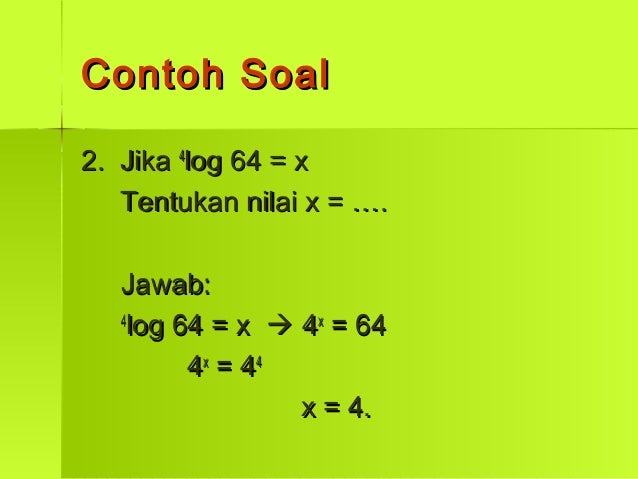 X Log 64 = 3 Nilai X Adalah / Apabila seratus mesin dihidupkan bersama, taraf intensitasnya adalah ….. Log_4 64 = 3 since 64 = 4^3. X is the result we get when the base b is raised to the power of a. Tanda … dapat ditulis dengan salah satu tanda pertidaksamaan : X log 64 = 3 , maka nilai x nya adalah. What is the value of log(a) x log(b)?