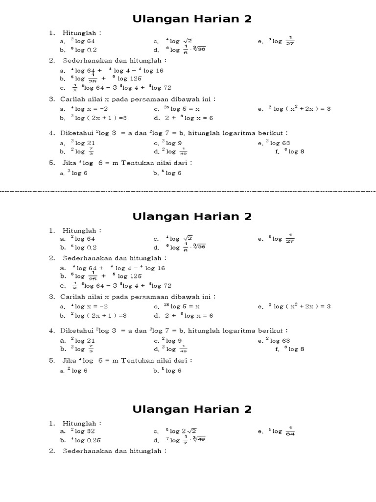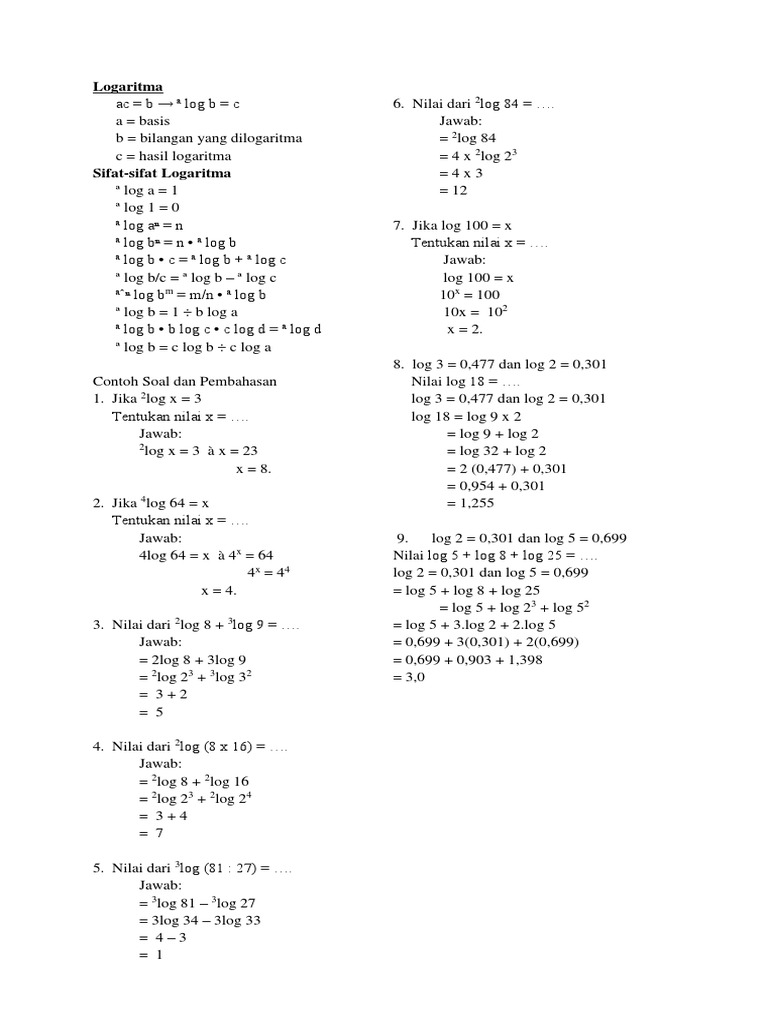 Wat is the base of log. Turunan log x, ln x, a^x dan e^x ? Dita mempunyai dua buah kardus berbentuk kubus. Therefore, it is always extremely important to verify your solutions inside the original equation. A adalah bilangan pokok, a>0 dan a tidak sama dengan 1. Ab ab dan q = 1,333 maka nilai log (pq) dengan 2a bilangan pokok 2 sama dengan. Log_4 64 = 3 since 64 = 4^3. Log10(3 ∙ 7) = log10(3) + log10(7). Normally, in logarithmic equations, a negative solution must be rejected because if a log is negative it is undefined. The logarithm of the division of x and y is the difference of logarithm of x and logarithm of y. Simplify using the rule #alogn = logn^a#. X is the result we get when the base b is raised to the power of a. Without using a mathematics table, find x, given that 6 log (x+4)=log64?